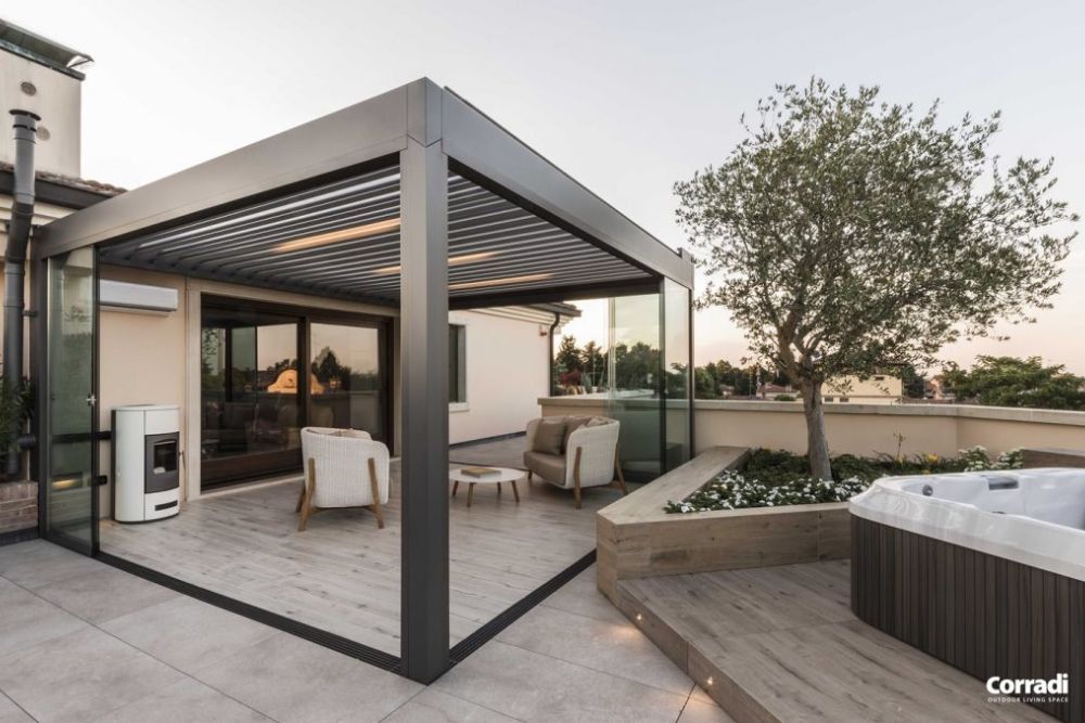 Una de las innovaciones más interesantes en el diseño de pérgolas es la inclusión de lamas bioclimáticas. Estas lamas se pueden ajustar para abrirse o cerrarse, permitiendo un control preciso del clima bajo la pérgola. Esto no solo mejora el confort térmico y la ventilación, sino que también permite aprovechar al máximo la luz natural, ofreciendo protección contra la lluvia y el sol según sea necesario.