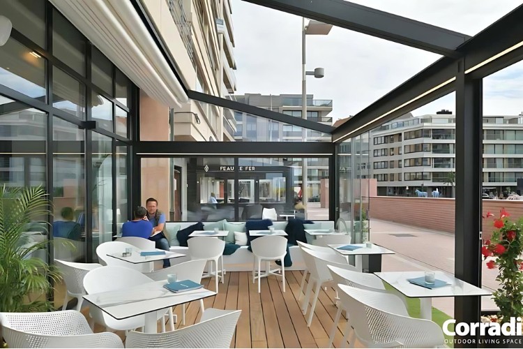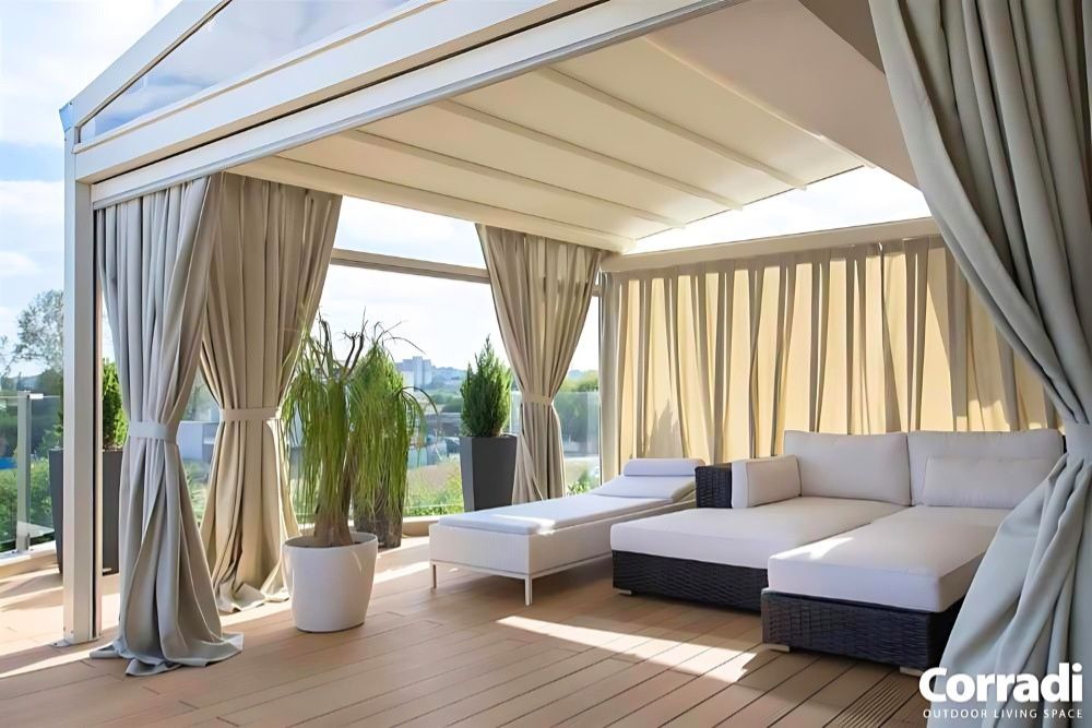 Además, la variedad de colores disponibles permite realzar la personalidad única de esta Pergotenda®. Desde antracita, marfil y blanco plus para un efecto impactante, hasta los sofisticados negro Noche y Dark Bronze. También se puede optar por colores RAL personalizados para combinar con plataformas modulares de cerámica o madera Ipé, aportando un cálido look con tonos que varían del marrón al verde oliva.